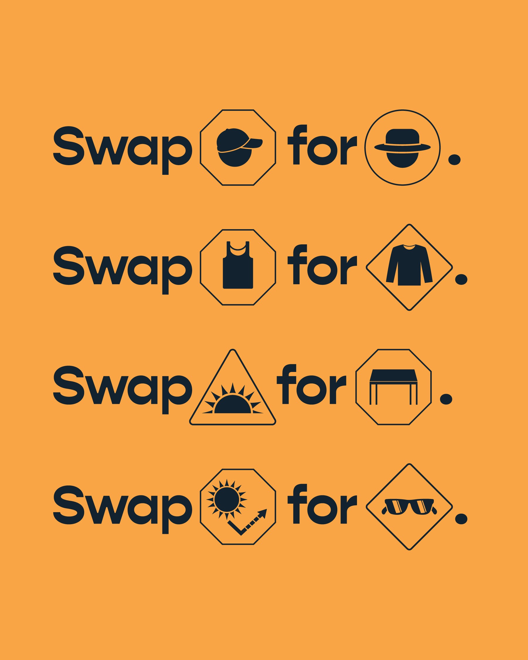 Together with the Hunter Melanoma Foundation, we took a loosely defined workplace program and gave it a campaign identity built to scale. HMF had the training expertise but needed a platform to carry it into boardrooms, onto worksites, and across screens. We developed "Swap it, to Stop it" as a positioning line that embeds the program name, frames sun safety as simple habit swaps like caps for broad brims and singlets for sleeves, and anchors the broader message of swapping sun risk with sun safety. The visual identity draws on a language outdoor workers already trust, signage, with bold icons inside familiar sign shapes turning health messaging into something processed at a glance. The result is a partner-ready campaign platform that positions sun safety as a workplace standard, equipping the Foundation to attract partnerships and make it easier for businesses to invest in their people.
